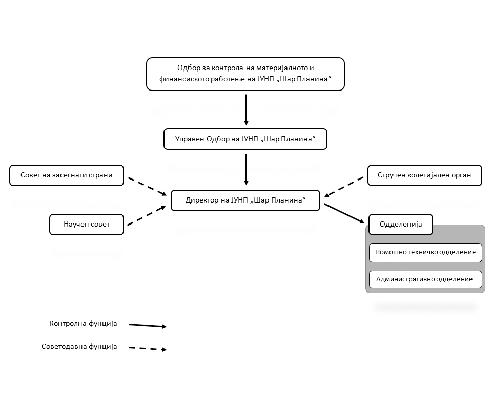 Со паркот управува Јавна Установа Национален парк Шар планина која со својот стручен и професионален кадар се грижи за природното наследство во паркот и управува со истото. Структурата на управување на паркот ги вклучува следниве тела: